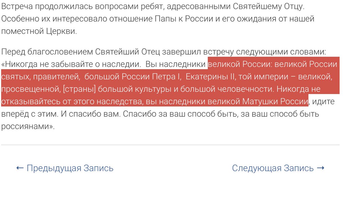 ... You are heirs of great Mother Russia. Go forward with it. And thank you. Thank you for your way to exist, for your way to be Russian". Wow. In this paragraph the Pope used the word "great" three times, mentioned two absolute monarchs, in context of enlargement of empire. /3