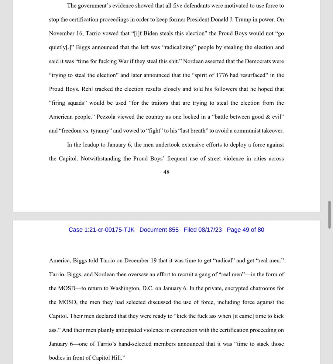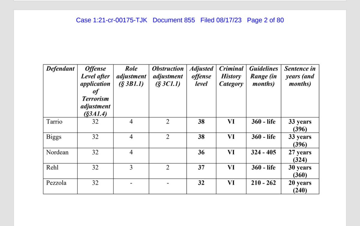 The Feds are seeking 33 years in prison for Proud Boys leader Enrique Tarrio (who was not physically at January 6) and Joe Biggs (the highest-ranking Proud Boy on the ground at the Capitol.)