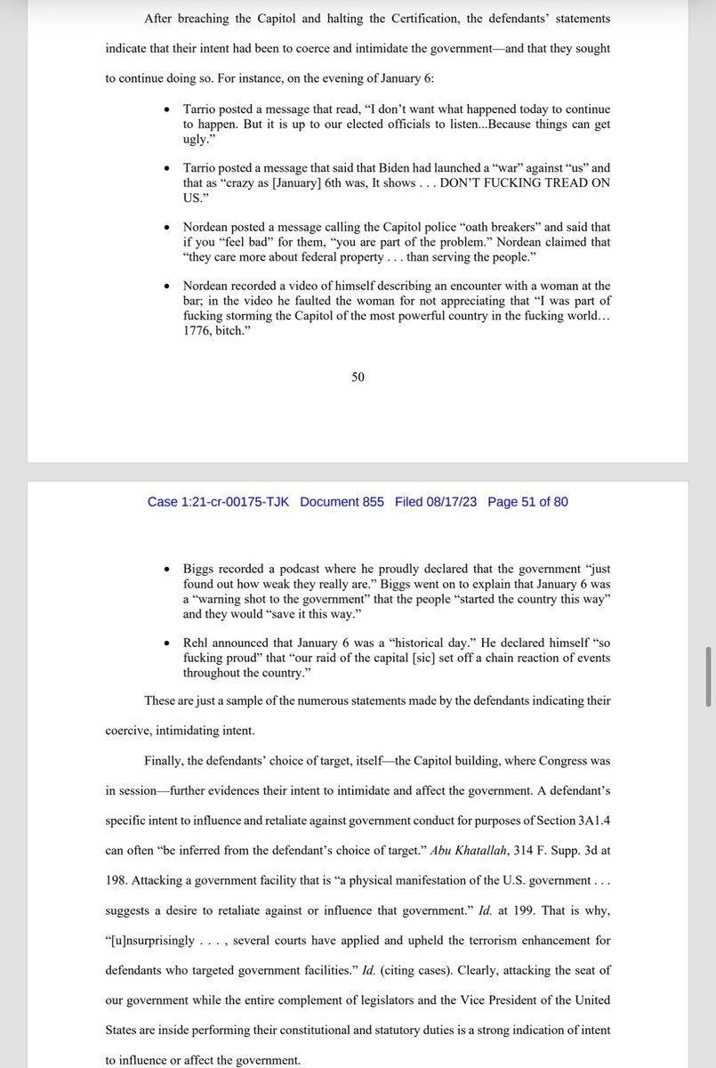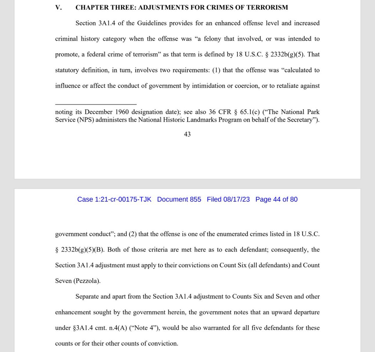 2) In the government’s argument for the Proud Boys to get between 20 and 33 years in prison each, they include a request to treat the charges as crimes of terrorism.