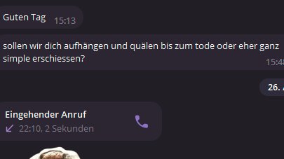 Etwas später am Abend rief sie mich den über Telegram an und sprach eine Reihe weiterer Morddrohung gegen mich aus. Dabei benutzte sie beim ersten Anruf einen Stimmenverzerre mit tiefer Stimme.