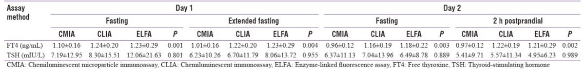 This study (done by my senior colleague) is the only one that tested whether food or time or both mattered. They also looked at 3 different assay methods. Day 1 8 AM and 10 AM samples of TSH (extended fasting) showed reduction of TSH. Day F vs 2 hr PP TSH showed even more ⬇