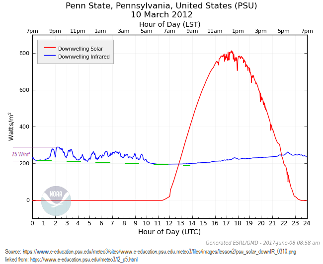 @Kenneth72712993 @ScienceBlog3 @RichardLWeiss @Anvndarnamn5 @Michael_D_Crow @ammocrypta @Data79504085 @BenKoby1911 @emilio97493490 @InspirallPE @Mark_A_Lunn @ChrisBBacon3 @SpiruSensei @DenisDaly @WernerReinhard5 @controscience @Willard1951 @Fynnderella1 @SapientHetero @Veritatem2021 @C_R_O_M________ @balls95652097 @S_D_Mannix @Devonian1342 @AndreGrossza @Climatehope2 @S_Metzeler @priscian @3GHtweets @PvtMcAuslan @EdwardRiffle @AuroriaEn @JusticeTrudeau @judgementalbe1 @AristotleMrs @Coleski14 @wallytoms0 @LesserMegadeath @BillPrecht @DiseaseMatters @CoralReefFish @DavidJSuggett @CoralResearch @SteinhartBart @CoralMorph @ConnTrinity @reefgenomics 4/6. Here's a plot of downwelling radiation (in blue) measured at Penn State on a day which was cloudy from about 8:30 PM to 5:00 AM, and then clear. You can see that cloud cover added a variable amount of downwelling IR, up to a maximum of about 75 W/m². sealevel.info/psu_solar_down…