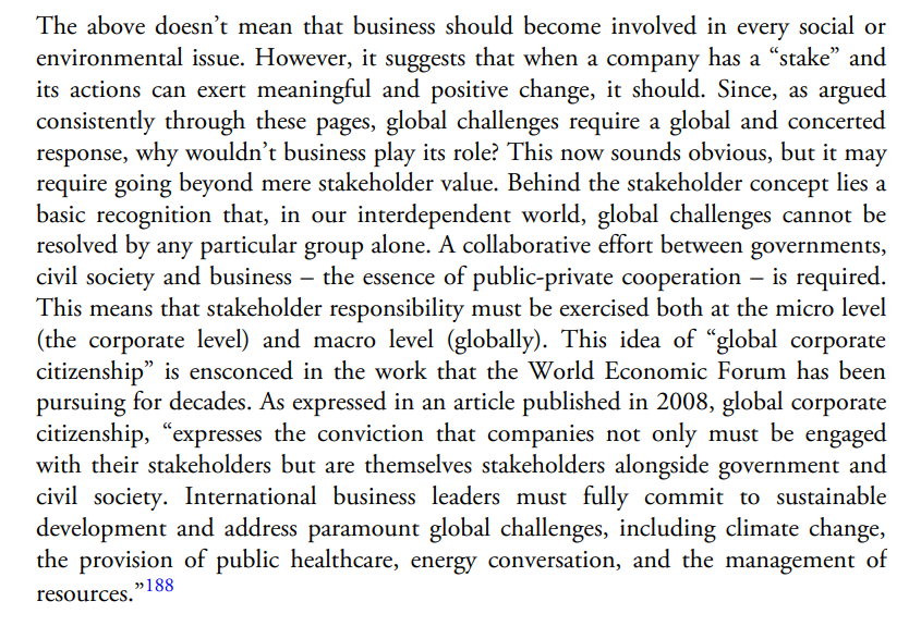 This "global corporate citizenship" model is "an absolute necessity" because "companies depend on the natural and social ecosystem in which they operate" (just like Marx insisted with his idea of "metabolism"). The old model is "outdated." *Employees* will help force the change.
