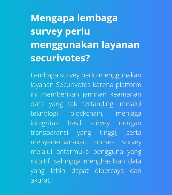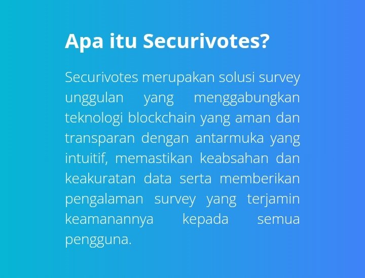 Securivotes adalah teknologi yg menjawab tantangan lembaga survey saat ini. Yaitu transparansi dan integritas data, serta hasil survey yg tidak diragukan karena menggunakan teknologi blockchain yg tidak bisa dimanipulasi hasilnya serta prosesnya dapat diawasi oleh publik.