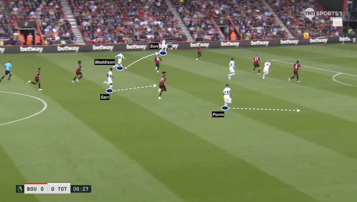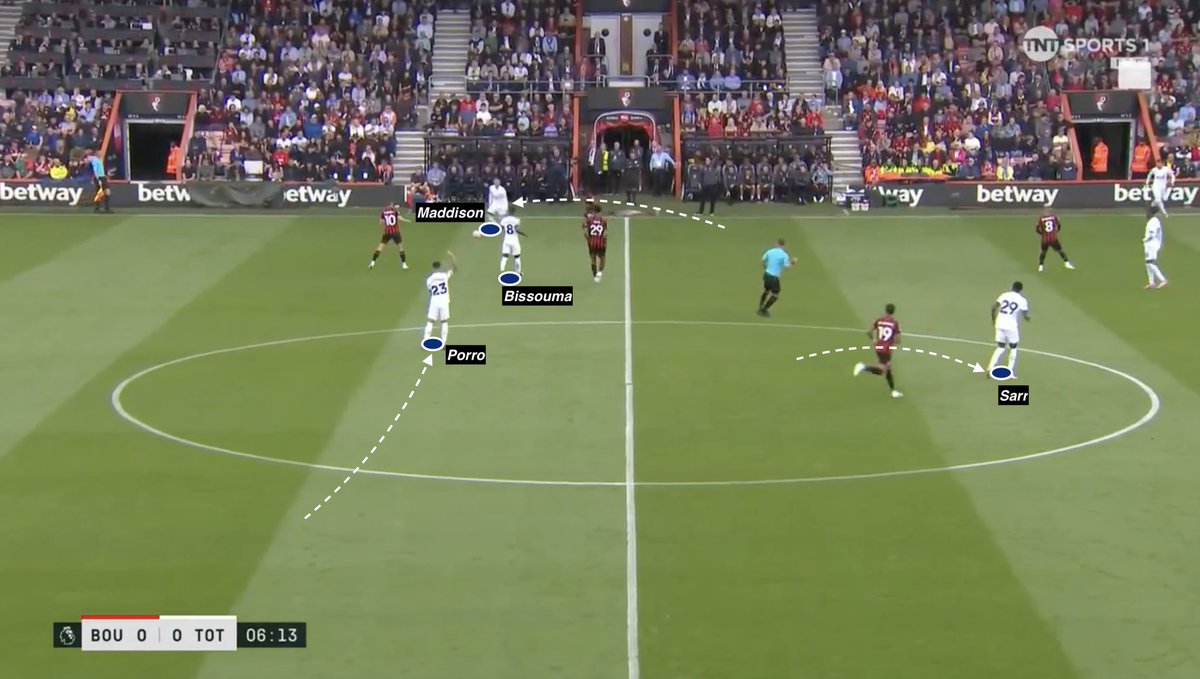 You evaluate the balance of a midfield by the variations in the positioning. With Postecoglou, each move is compensated by another player. When Maddison drops, Sarr usually steps up forward, while Porro occupies centre area as inverted FB.