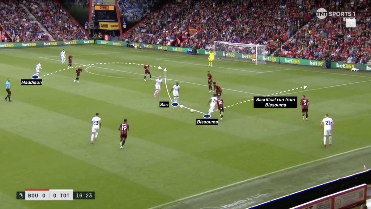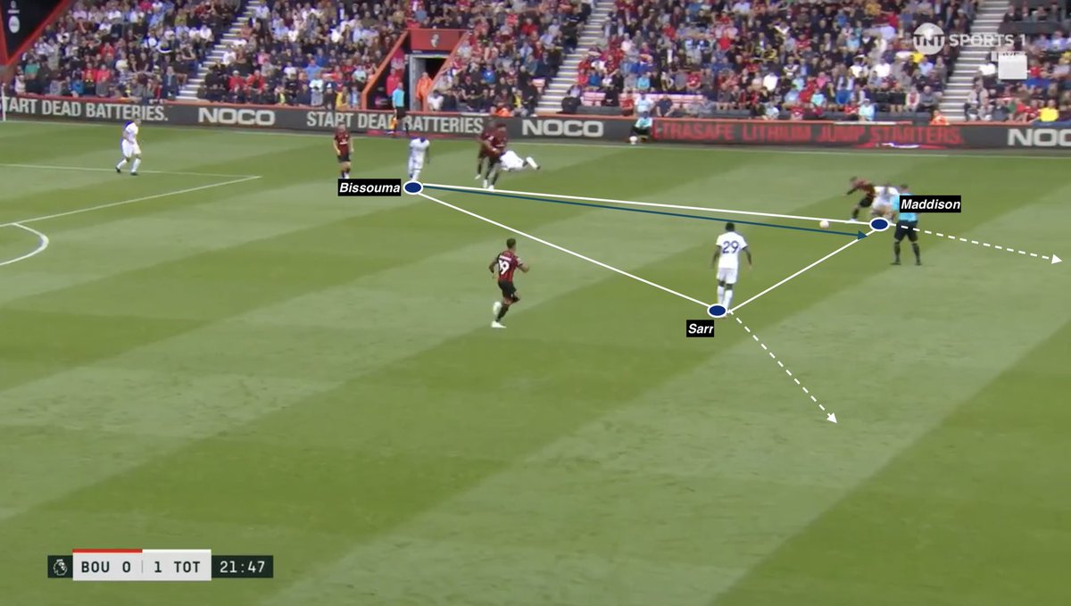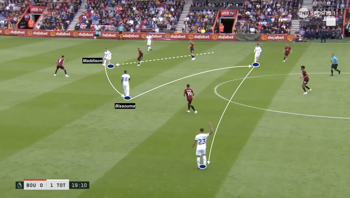 Bissouma is a precious profile for Postecoglou, because he can eliminate a pressing with his ball retention. Turn around quickly, slowing down the rhythm, and then accelerate with Maddison and Sarr.