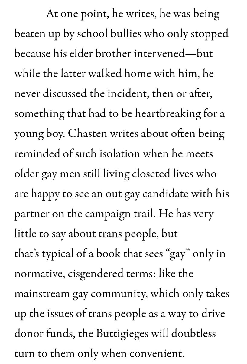 This is relatively fair, but Chasten is not trans himself so I obviously understand why he wouldn't focus on something he doesn't know first hand about in an autobiography