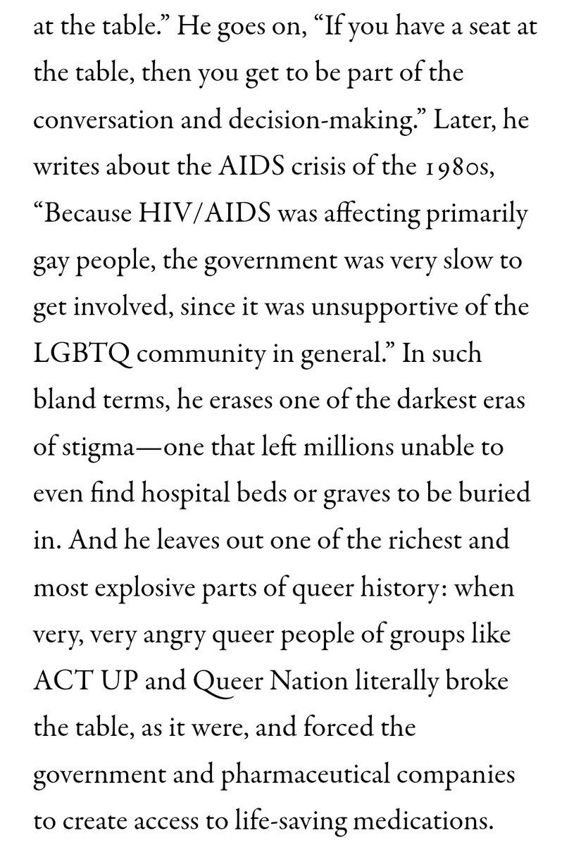 Again, fair, but this is a YA autobiography. Chasten was far too young for this fight, and I fail to see how the quote there denies that the fight was necessary - especially given that the radical activists still relied on progressive politicians to enact meaningful change