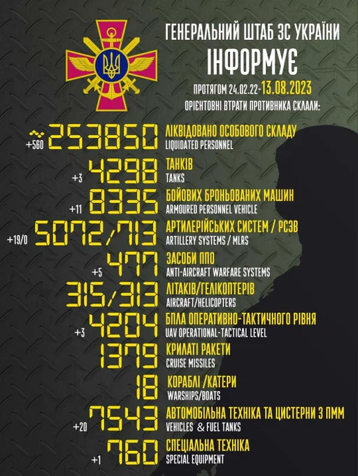 As usual we start with Russian losses per 30/08/23 reported by the Ukrainian general staff. We include visual losses or damaged equipment from Russian forces as well.