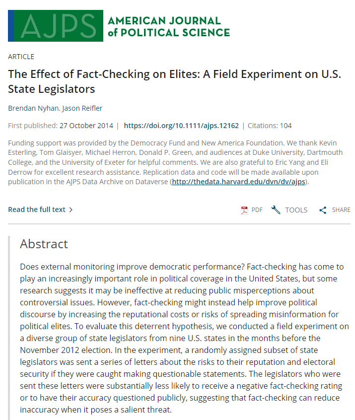 Aux États-Unis, les élus prévenus par courrier que leur réputation et leurs chances de l’emporter pourraient être mises à mal s’ils faisaient des déclarations douteuses pendant la campagne électorale 2012 "étaient beaucoup moins susceptibles" de lâcher des inexactitudes.