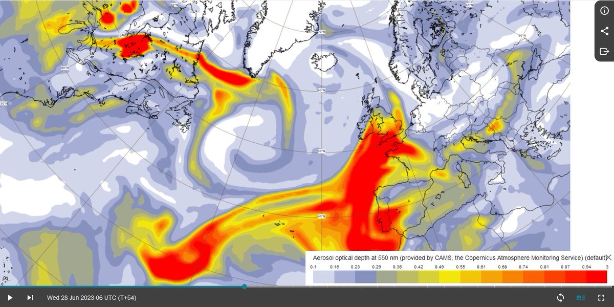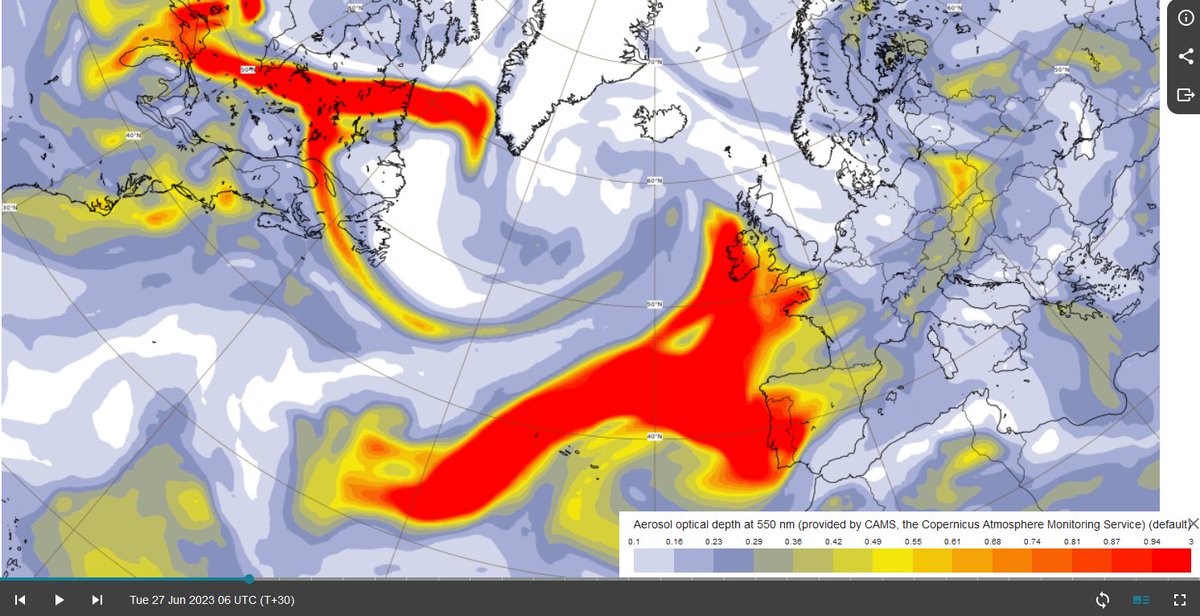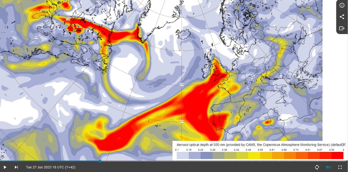 🔥 Le panache de fumée des feux de forêt au Canada arrive sur l'Europe, "de la péninsule ibérique à l’Irlande et il devrait continuer à traverser les parties du nord et du centre de l’Europe" ces prochains jours.