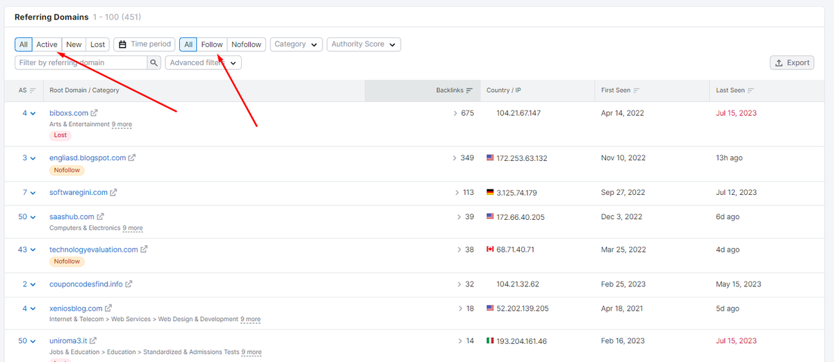 Step #4. Filter the backlinks by "do-follow" and "active" as follows.