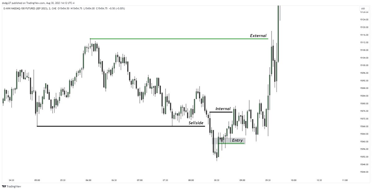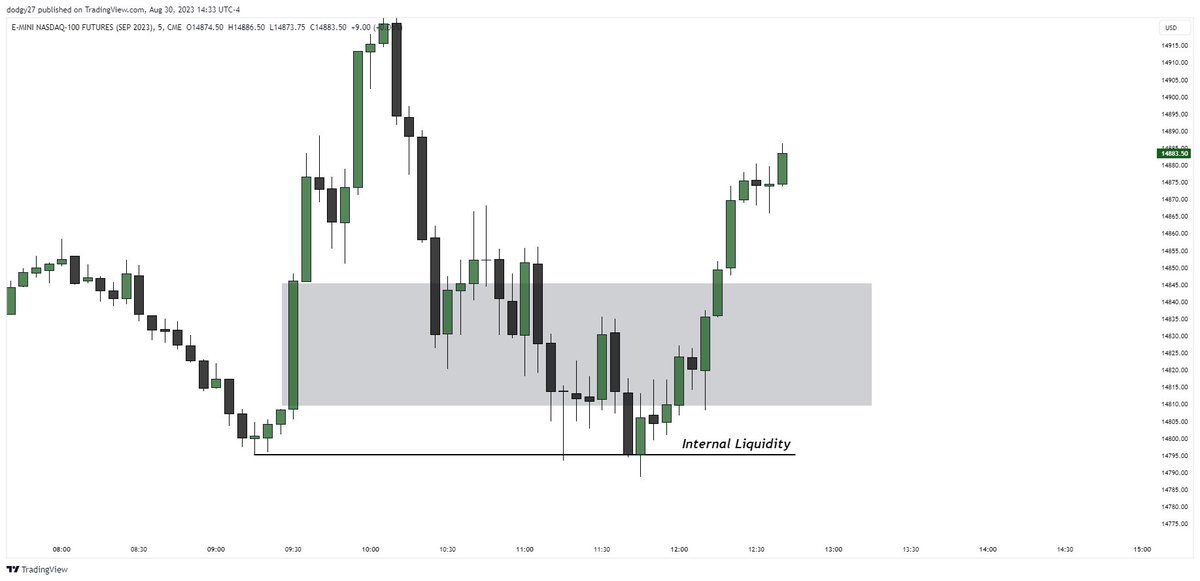 In this example, let’s assume we know the HTF bias is bullish, we get the entry and we enter because we haven’t hit the internal liquidity