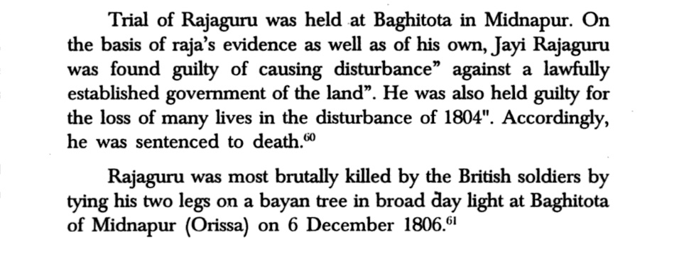 Rajguru was found to be guilty of rebellion against the British & he refused to . In 1806, the British soldiers brutally killed him by tying his legs on a banyan tree in broad daylight in Baghitota.