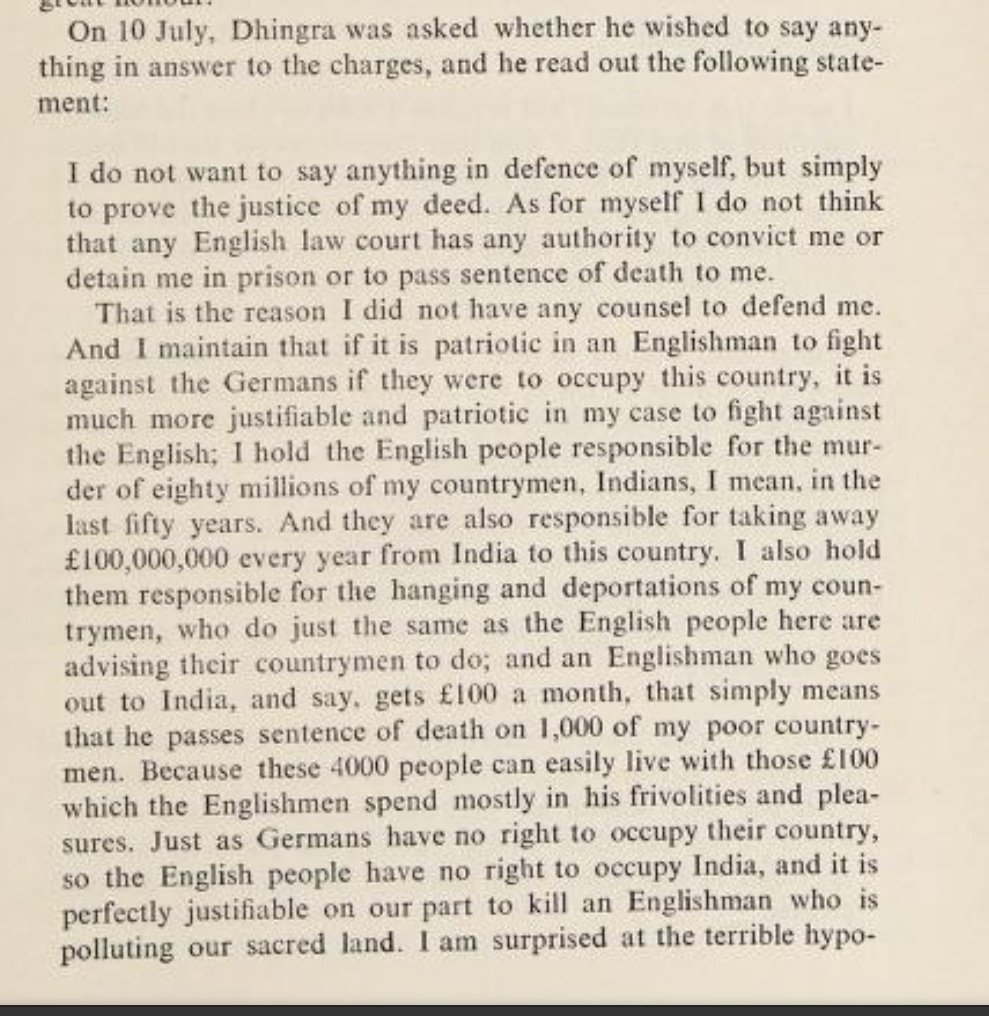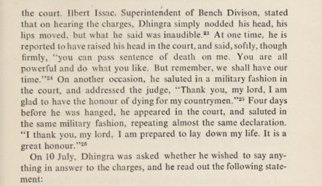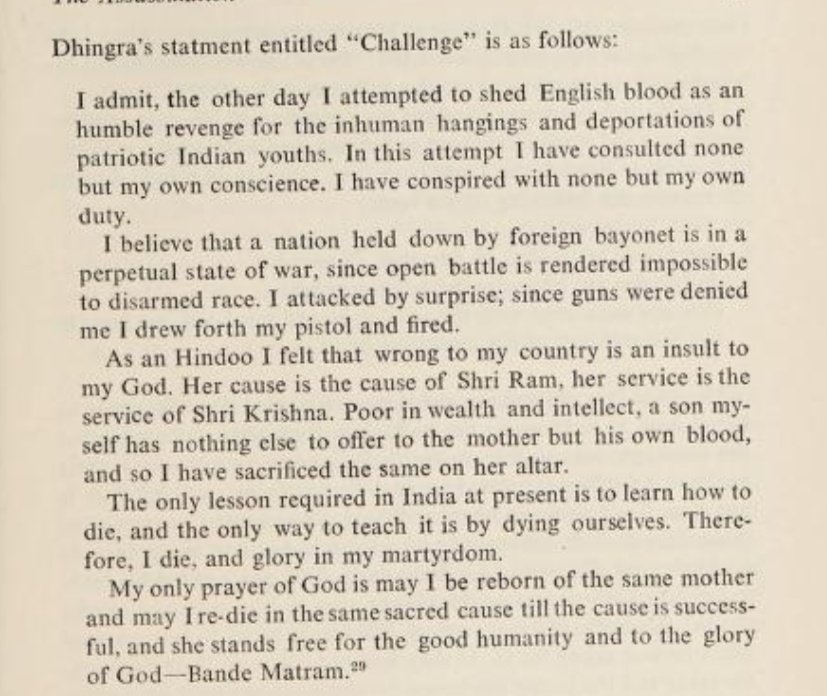 “As a Hindu, I felt that wrong to my country is an insult to God. Her cause is the cause of Shri Ram, her service is the service of Shri Ram, poor in health & intellect a son like myself had nothing to offer to mother other than his own blood...” — last speech of Madan Lal Dhingra.