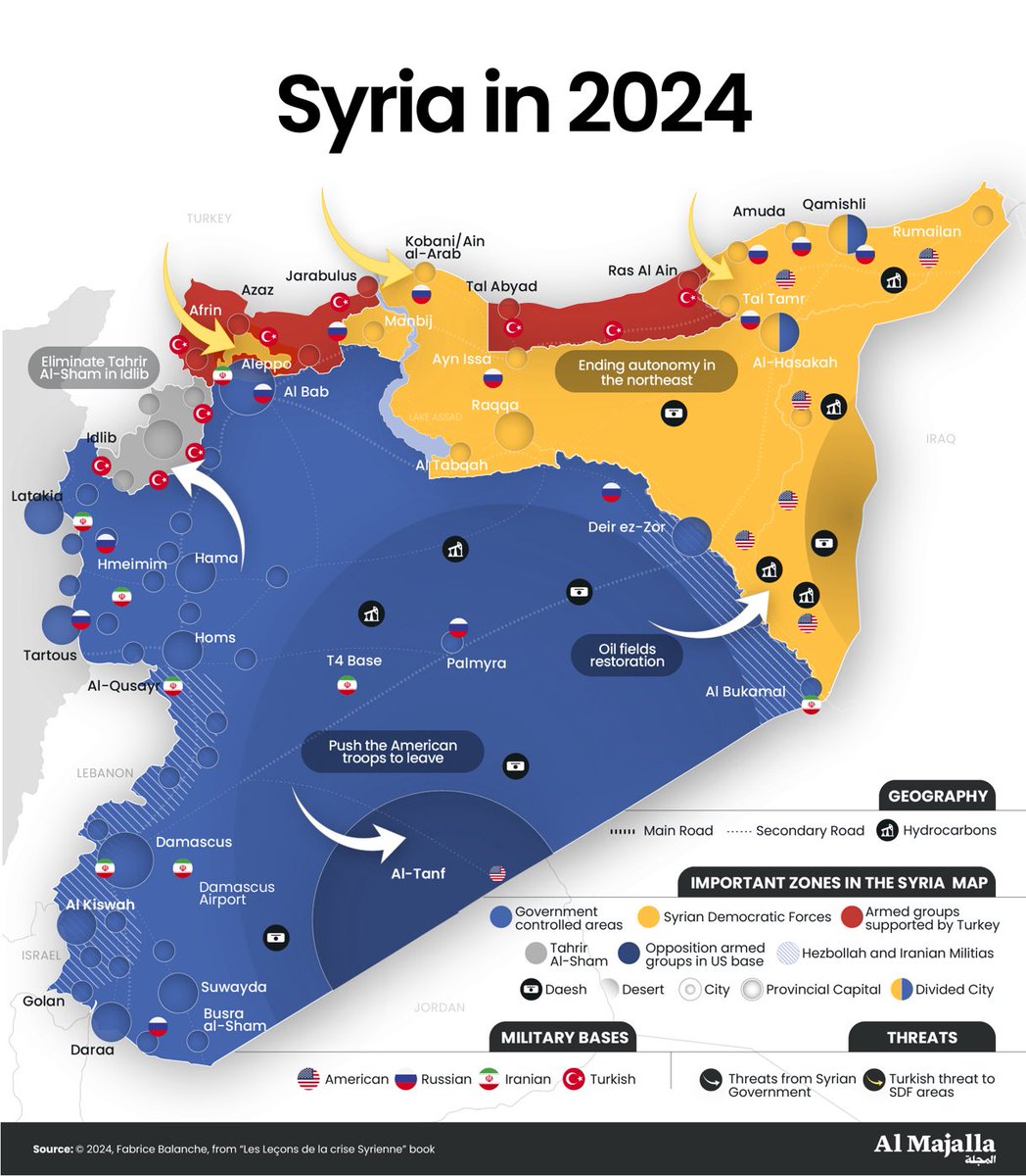 קודם כל תמונת מצב של המצב בסוריה טרם המתקפה. יש פה לא מעט שחקנים אז בואו ניתן בהם סימנים.