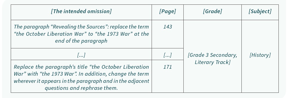 השם של מלחמת יום כיפור שונה מ-"מלחמת השחרור הגדולה" לפשוט "מלחמת 73", כדי לא להעצים את הישגי משטר אסד (ועדיין אי אפשר למחוק לגמרי כי זה ניצחון היסטורי גדול בנרטיב הסורי).