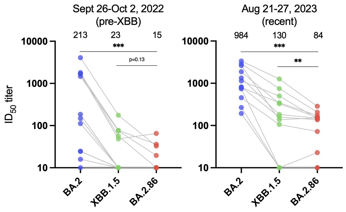 The pre-XBB samples were poor at neutralizing BA.2.86 (and not much better against XBB.1.5). But, somewhat encouragingly, last week's samples were substantially better, with 8 out of 12 neutralizing BA.2.86 at titers over 100.