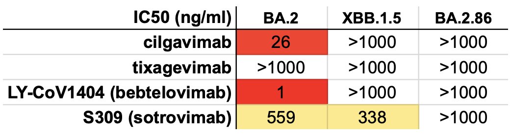 We also screened a few monoclonal antibodies. BA.2.86 was resistant against all of these, including sotrovimab (which was previously quite robust, if not very potent).