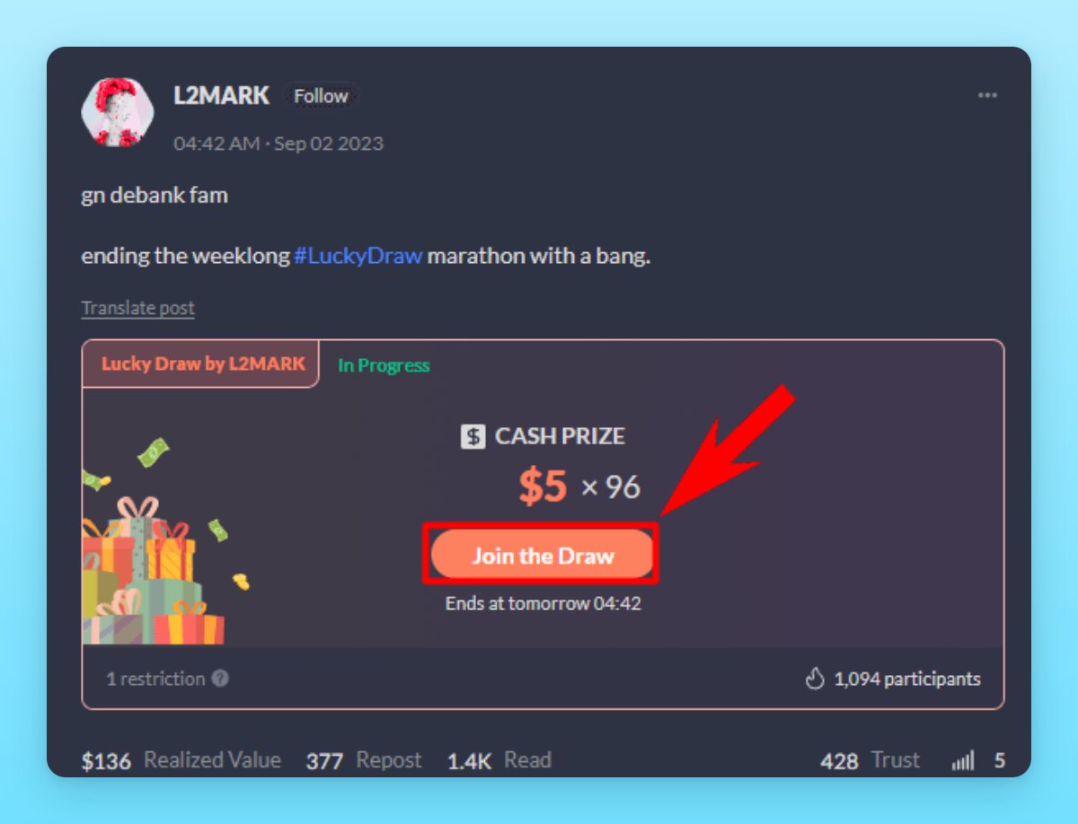 Visit DeBank -> Stream -> New post -> Lucky Draw