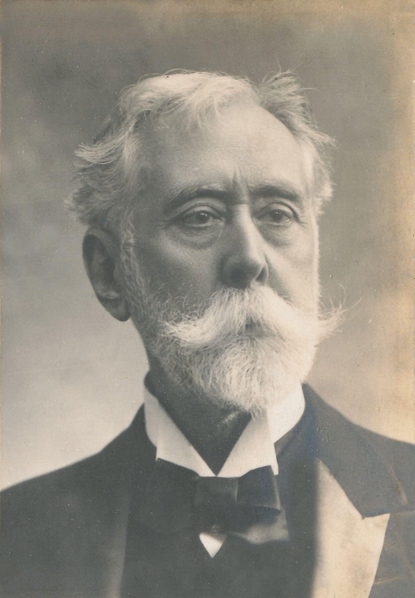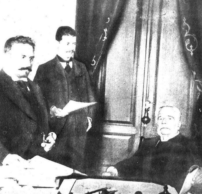 Fotografía que retrata al doctor Joaquín V. González, rodeado de libros, en su oficina de la Capital Federal en el año 1915, cuando se desempeñaba como senador nacional por la provincia de La Rioja.
