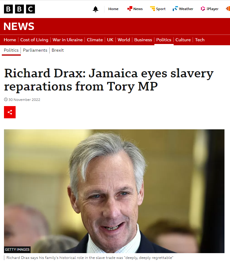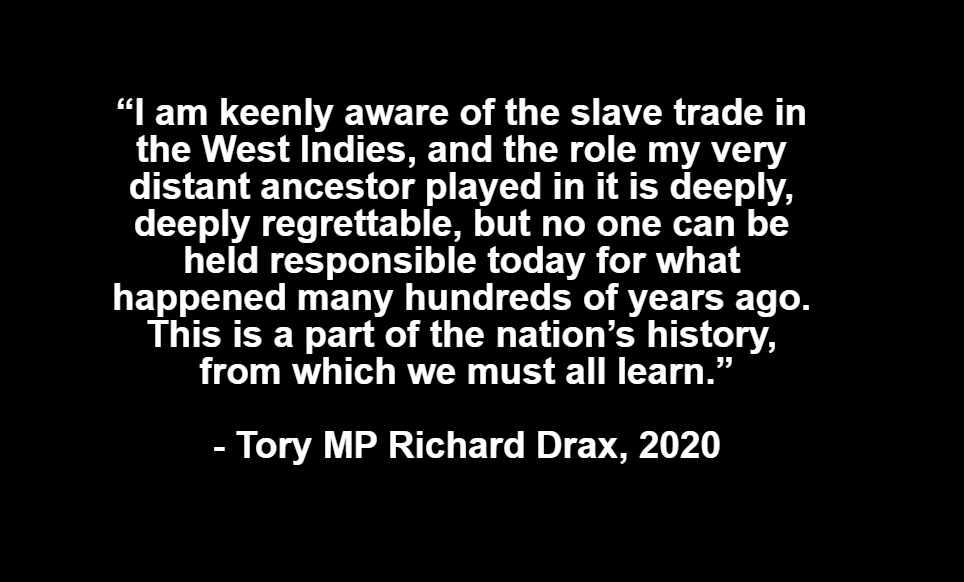 As stated at the top of this thread, James Drax was the first – or one of the first – planters in the British empire to move to a workforce of enslaved Africans where the children of slaves were held in perpetuity. His descendant is the Tory MP for South Dorset, Richard Drax.
