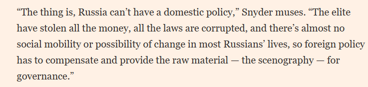 policy. Or, as @TimothyDSnyder describes it's replacement by "sadopopulism". Citizens are not intended to be rallied around a political idea or social vision but, akin to the 3rd Reich, behind a mythical and in essence apolitical dogma of Russian entitlement and greatness. 5/