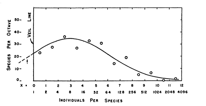 In addition, in his classic 1948 paper in Ecology, Preston argued that when one had sampled only a small portion of the individuals, there would be a veil line that made the log-normal look like a log-series distribution. 4/#
