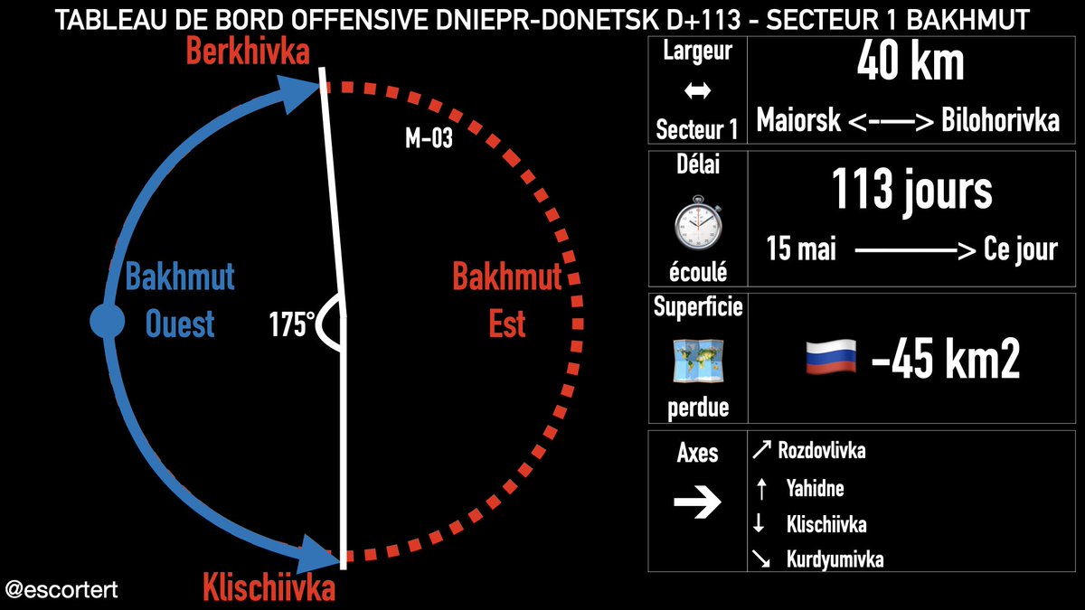 donne accès à la M-03 mais🇺🇦tentent de contourner le goulot d’étranglement dans l’axe #Zalizhnianske, au nord-ouest de #Bakhmut