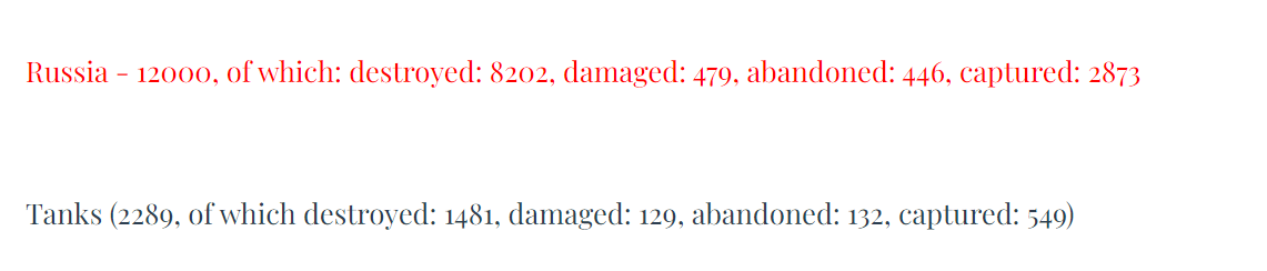 11/ According to Oryx estimates, russian tank losses currently stand at approximately 2,289 tanks and continue to rise, which forces russians to take tanks from their reserves, undergo refurbishment, and carry out modernization processes. This usually takes at least 30 days.
