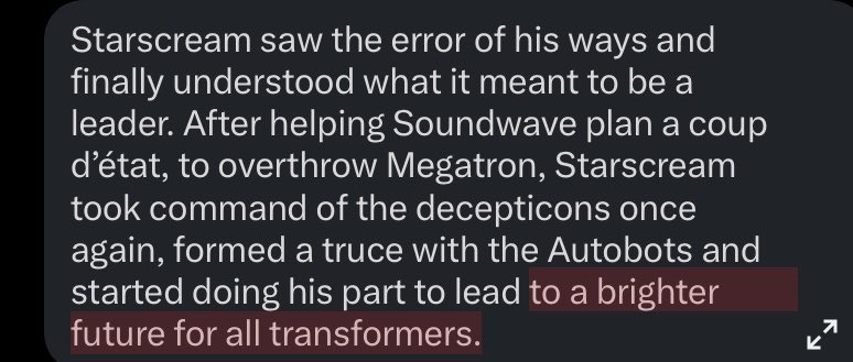 more focused on Megatron’s presentation as a leader. Wouldn’t be long before they both became ascenticons and later Decepticons. When the war broke out Skyfire was horrified by the decepticon’s brutality while Starscream reveled in it which led to the two falling out.