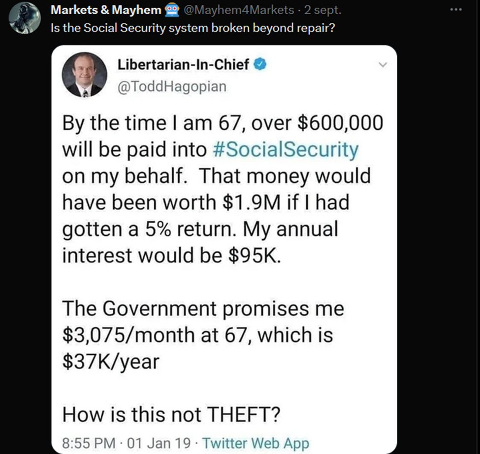 @JeffSnider_AIP @ToddHagopian «Cuando tenga 67, más de 600k habrán sido pagados a la Seguridad Social a mi nombre. Este dinero valdría entonces 1.9 millones, si hubiera recibido un interés del 5%. Mis dividendos anuales serían de 95k. El gobierno me promete 3.075/mes a los 67, que son 37k/año.