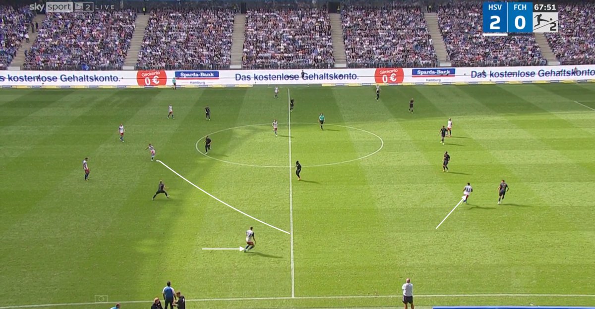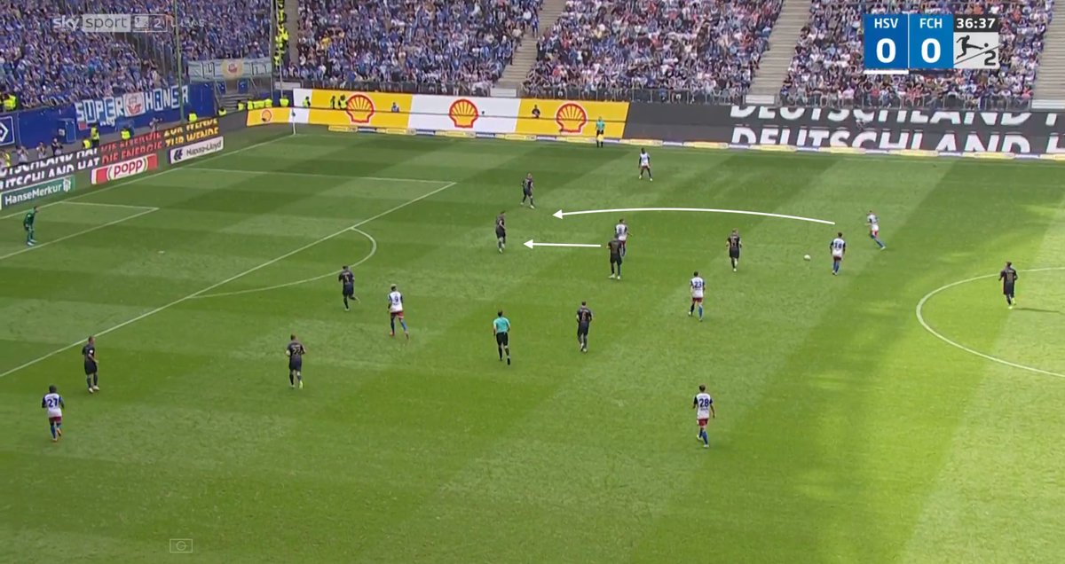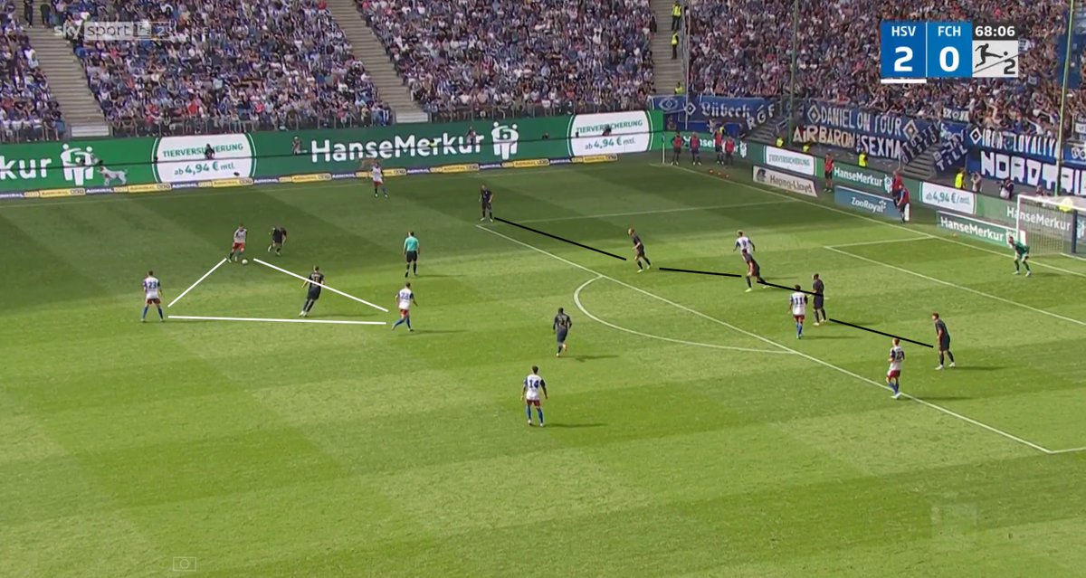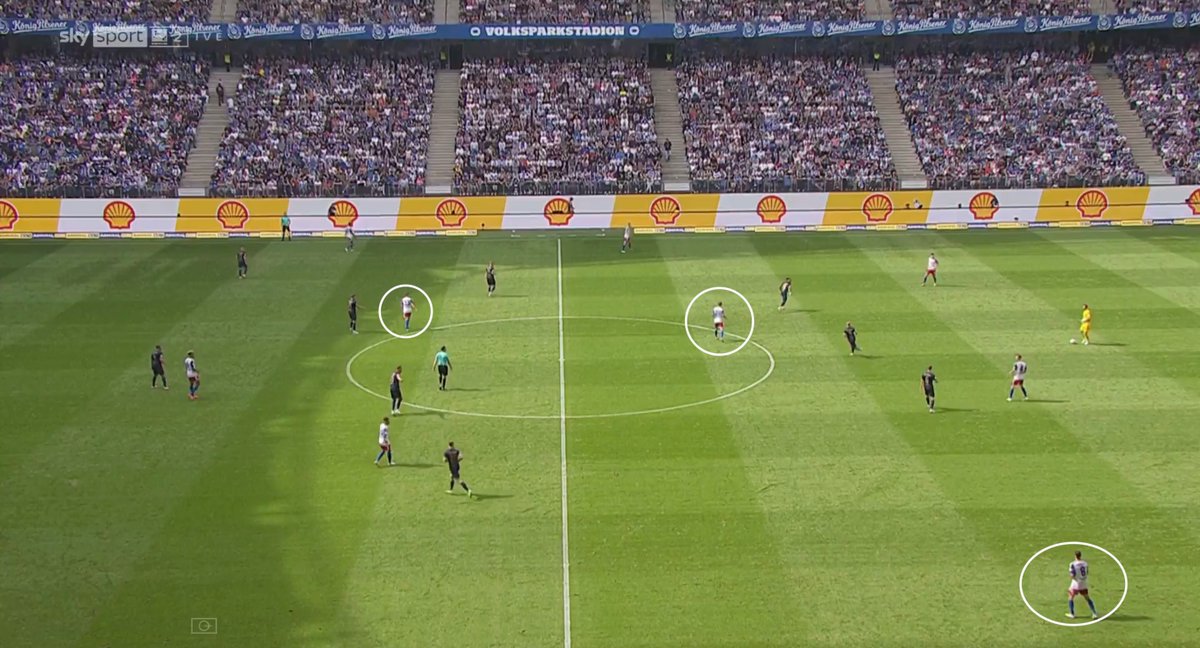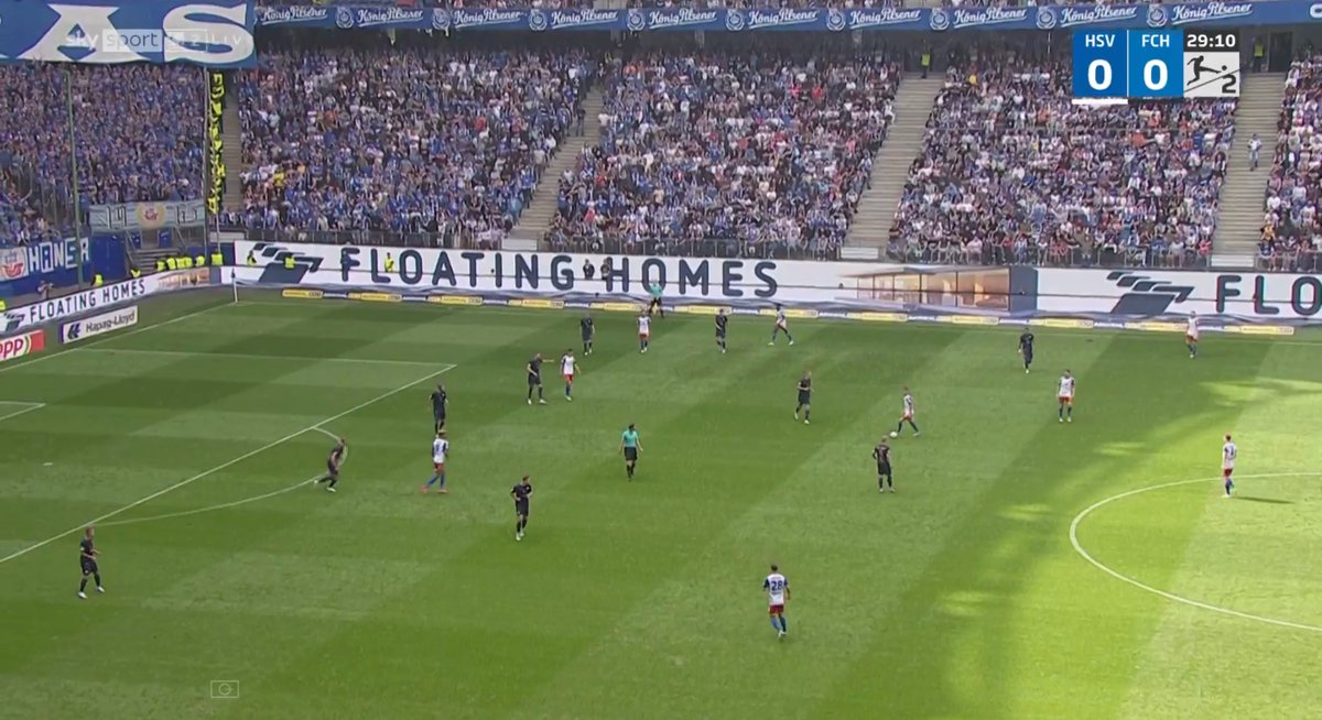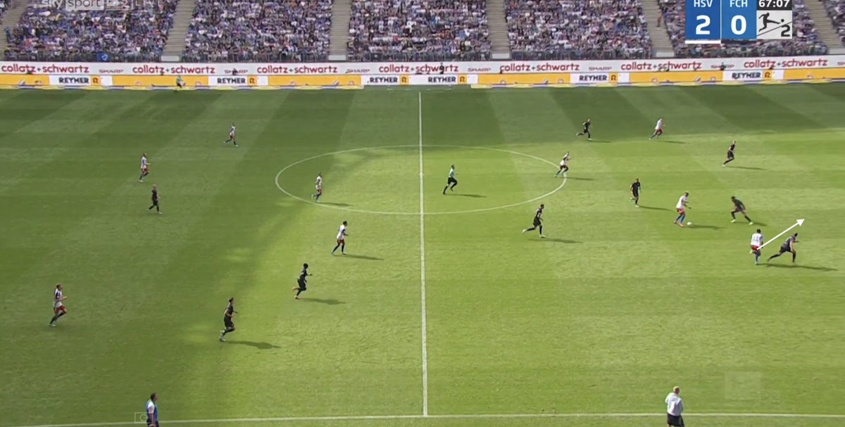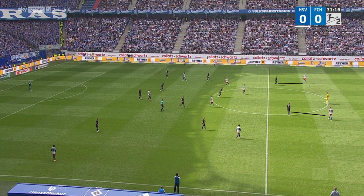 Zusätzlich stand der HSV sich öfter auch selbst im Wege. Teils gab es eher unglückliche Staffelungen im eigenen Spielaufbau, aus der ein progressives Spiel nach vorne eher schwierig umzusetzen ist.