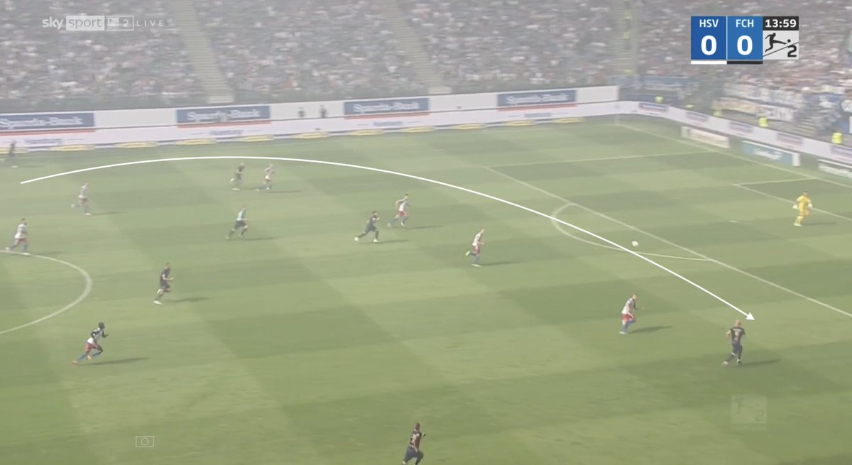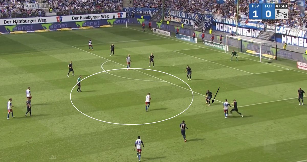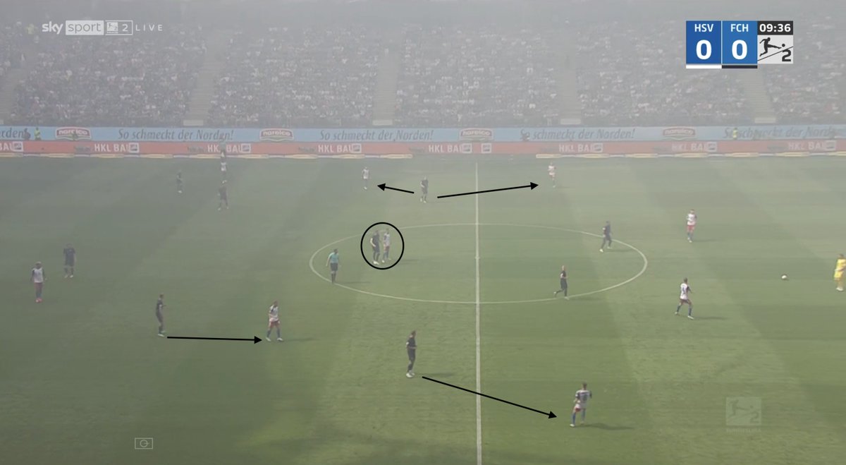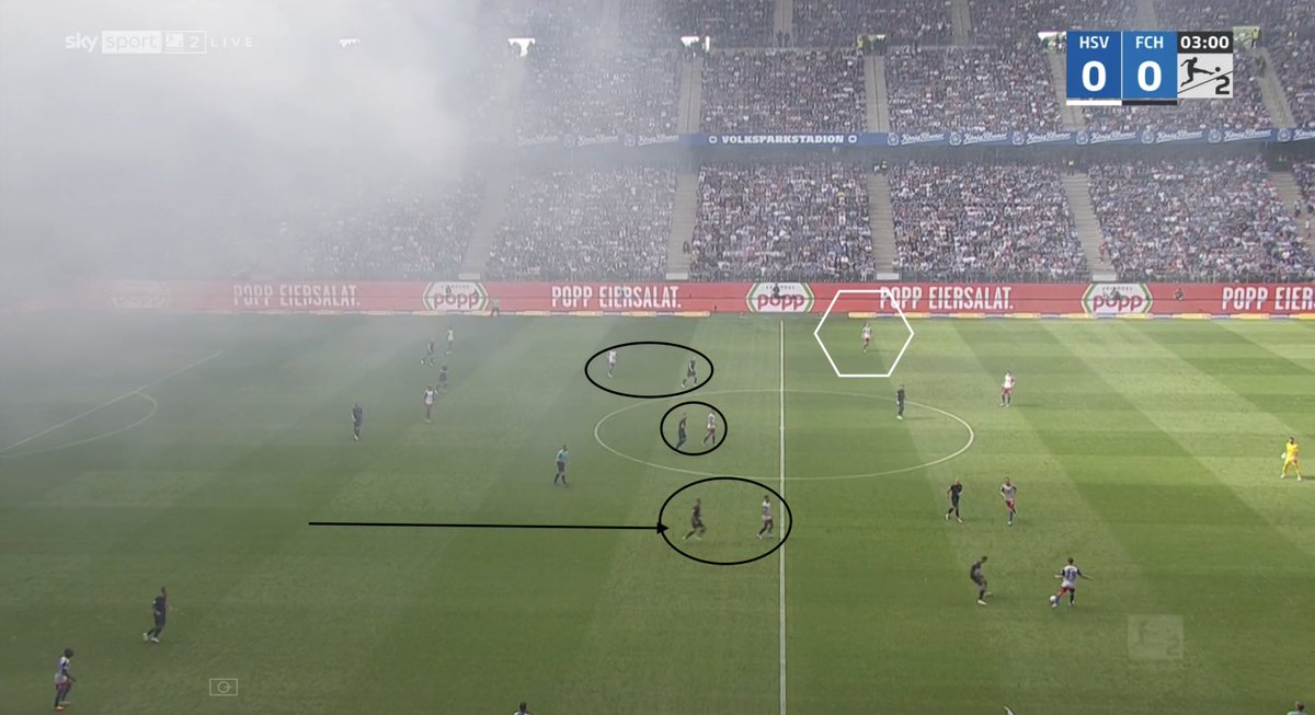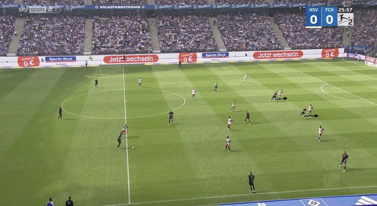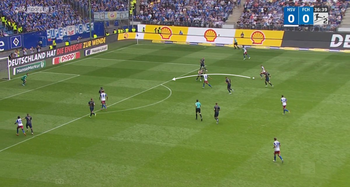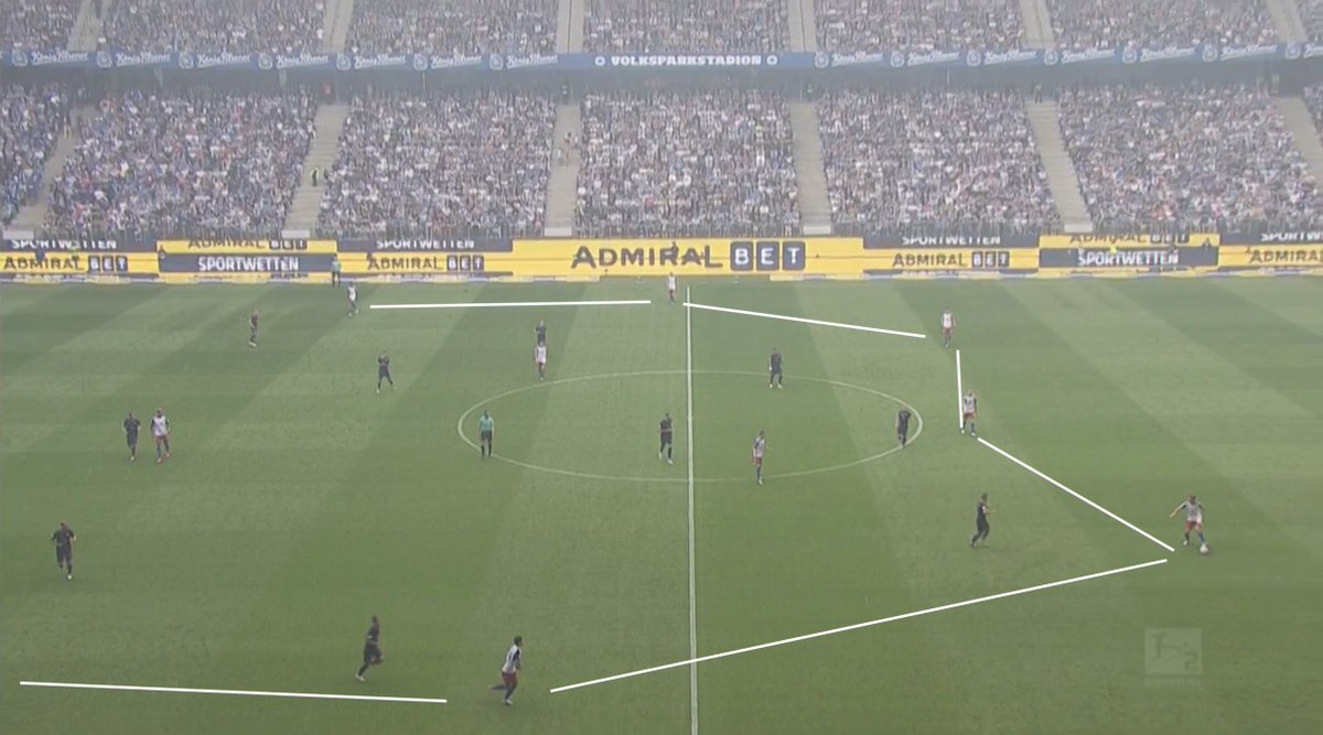 Zusätzlich stand der HSV sich öfter auch selbst im Wege. Teils gab es eher unglückliche Staffelungen im eigenen Spielaufbau, aus der ein progressives Spiel nach vorne eher schwierig umzusetzen ist.