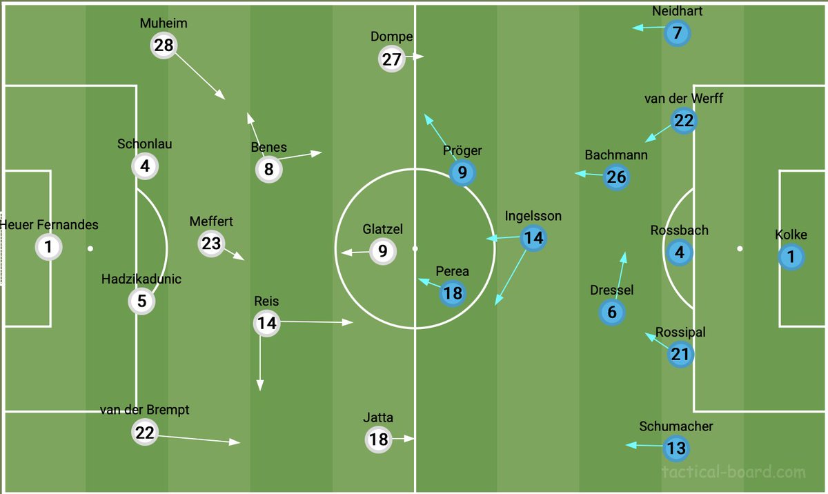 Ingelsson unterstützte Pröger und Perea situativ beim Anlaufen. Neidhart und Schumacher standen meist tief im 1 gegen Jatta oder Dompe.