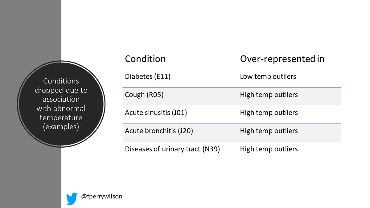 That's a data-driven way to find a diagnosis that does something to body temperature. And a lot of these were predictable (cough, UTI), but actually diabetes was MUCH more prevalent in the low outliers body temp-wise. So ALL people with diabetes were dropped from the "normal" pop