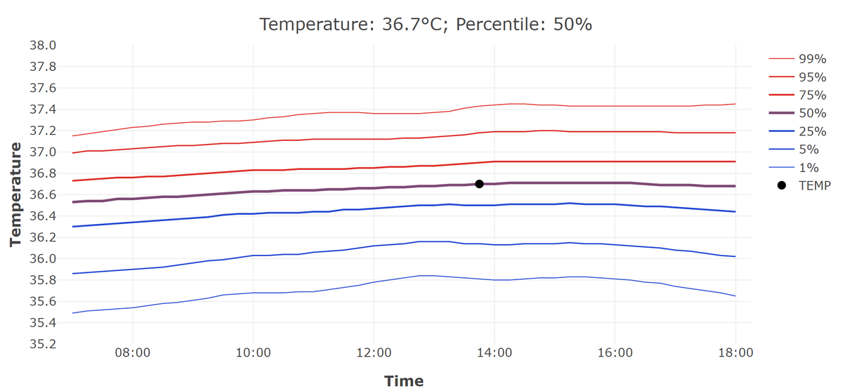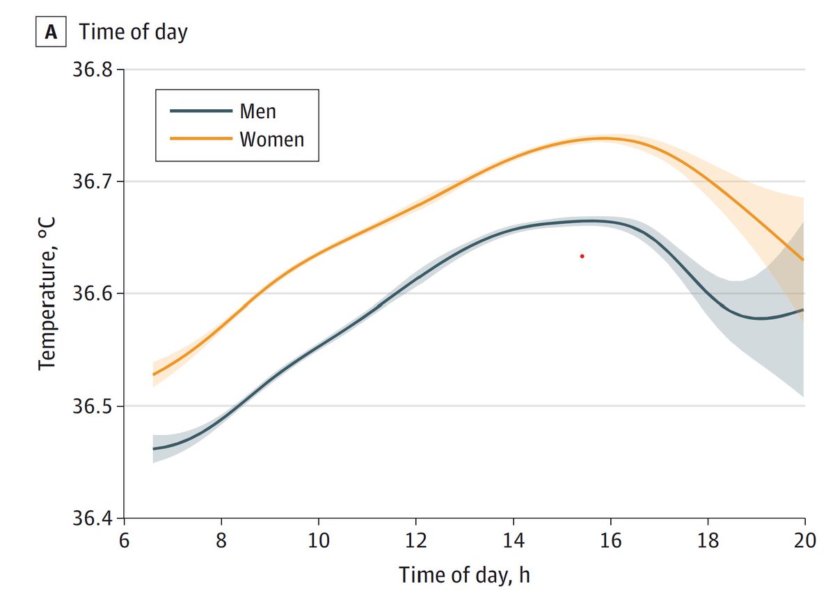 They even created a little web calculator that you can visit which will tell you YOUR normal temperature based on these parameters. Here's mine for 2pm. normaltemperature.stanford.edu