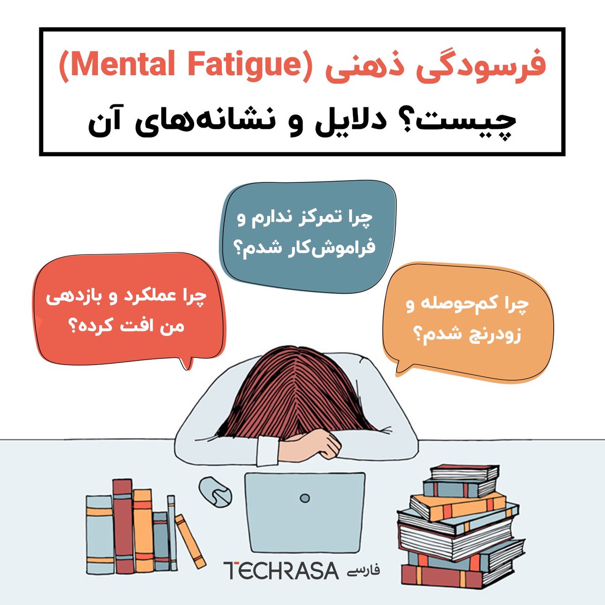 خستگی و فرسودگی ذهنی در اثر فعالیت و بار ذهنی بیش از حد و طولانیمدت بوجود مییاد. فرسودگی ذهنی میتونه باعث کاهش بهرهوری، تغییرات خلقوخو و حتی مشکلات جسمی بشه./۳
