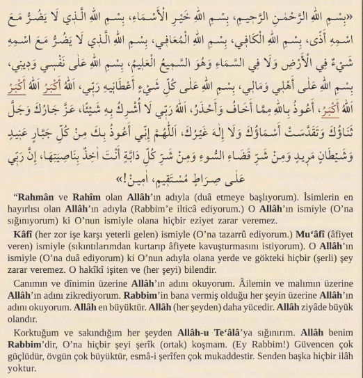 Bismillâhi alâ külli şey in a'tânîhi rabbî. Allâhu ekber, Allâhu ekber, Allâhu ekber. Eûzu billâhi mimmâ ehâfu ve ahzer. Allâhu rabbî lâ üşriku bihi şey e. Azze câruke ve celle senâuke ve teqaddeset esmâuke ve lâ ilâhe ğayruk.
