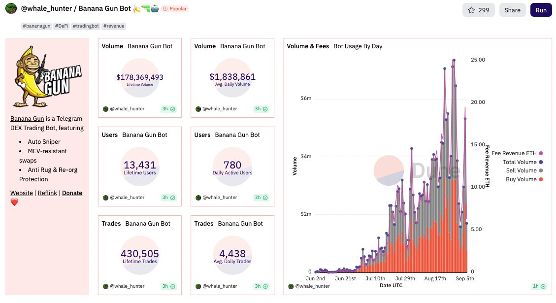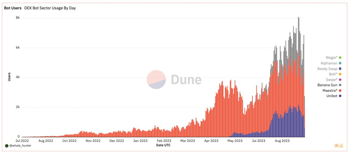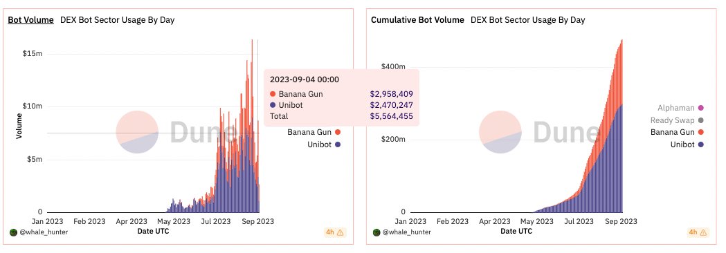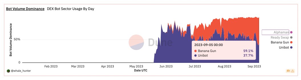 9/n Performances: @BananaGun_Bot has attracted significant user volume and trading activity, surpassing Unibot since the presale announcement. Cumulative users stand at 13,462 for BananaGun compared to 14,722 for Unibot. Dune Analytics from @whale_hunter_