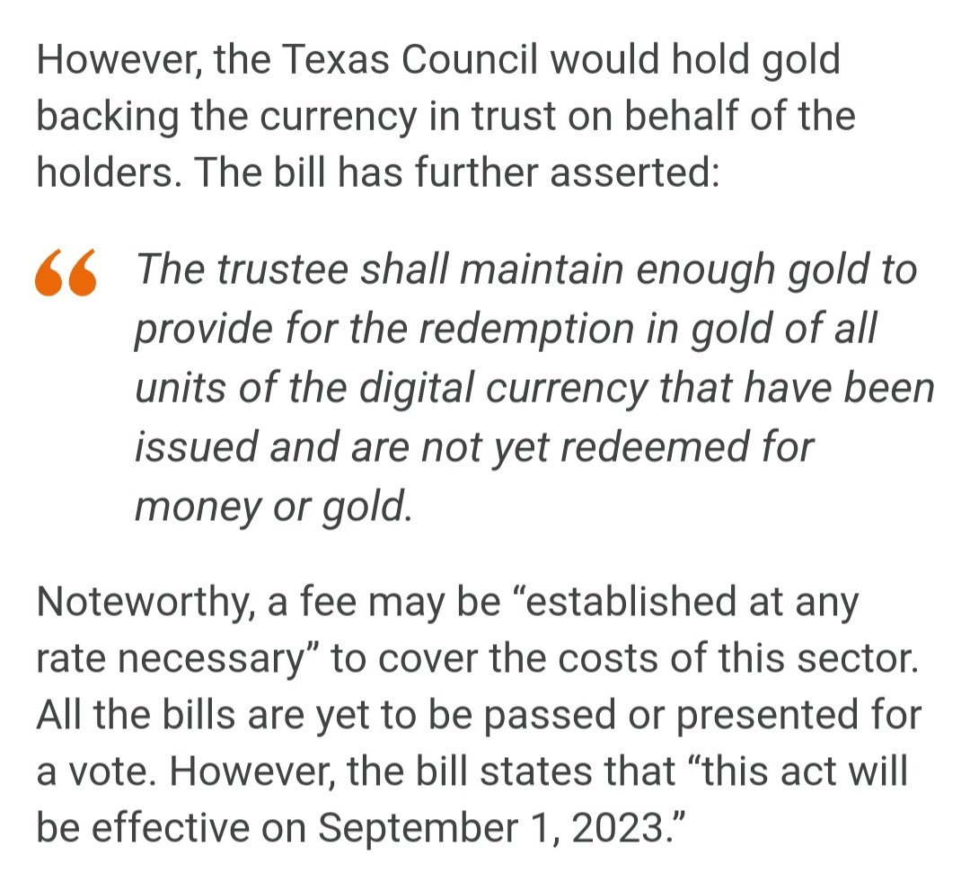To be honest it already did in Arkansas. On April 11, Arkansas passed a bill that makes gold and silver legal tender, allowing its citizens to use gold specie to legally pay debts and obligations without having tax implications. So Texas is probably the 2nd state.