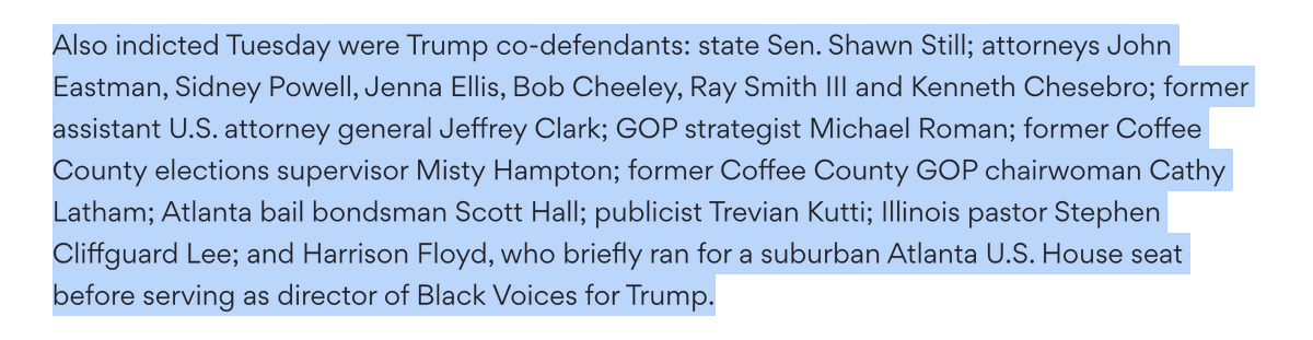 Among the indictees are lawyers affiliated with the Trump campaign, including Rudy Giuliani, John Eastman, Sidney Powell, Jenna Ellis and Kenneth Chesebro. Several are well-known Georgia attorneys, incl Bob Cheeley and Ray Smith