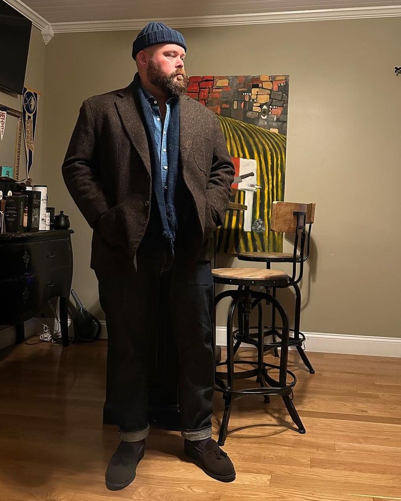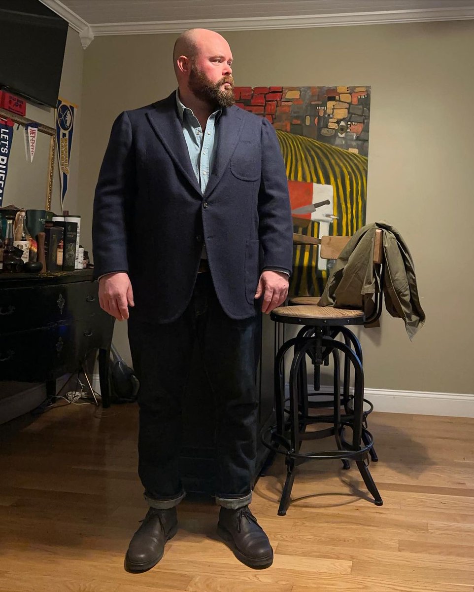 my friend @DavidLaneDesign, who i mention often on here, mostly wears tailoring and workwear. dark jeans go with sport coats (blue hopsack or brown tweed) or casualwear (brown suede chore coat or olive field jacket). even light blue chambray transfers.