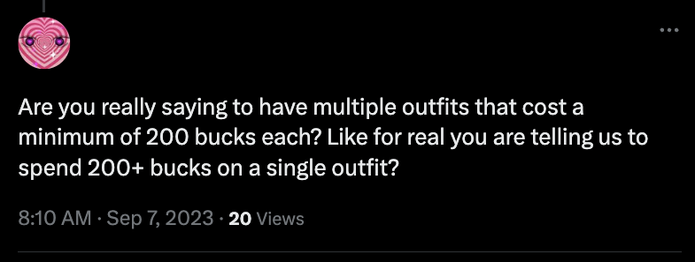 sorry if all this is very obvious. but i get this sort of reply often ("are you seriously recommending a $200 outfit?"). you do not buy outfits. you slowly build a wardrobe over a long period of time, and from that wardrobe, you mix and match things to create outfits.