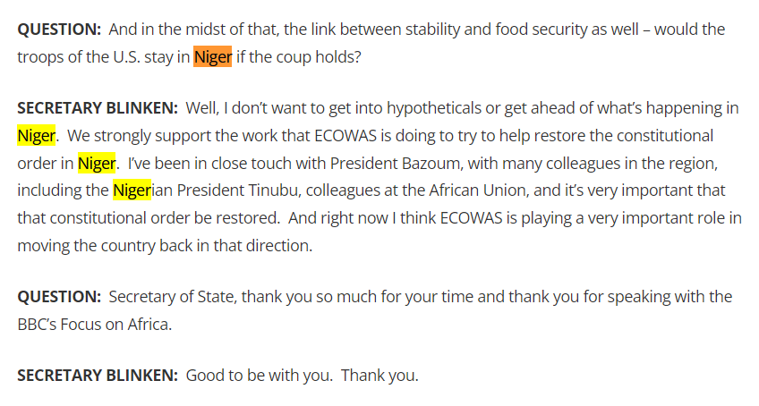 The previous thread is archived below. There has been a major development. Following the abortive mission by the "angel of death" Victoria Nuland to Niger, Antony Blinken has granted an interview with the… https://t.co/GDCrCRdJjrtwitter.com/i/web/status/1…