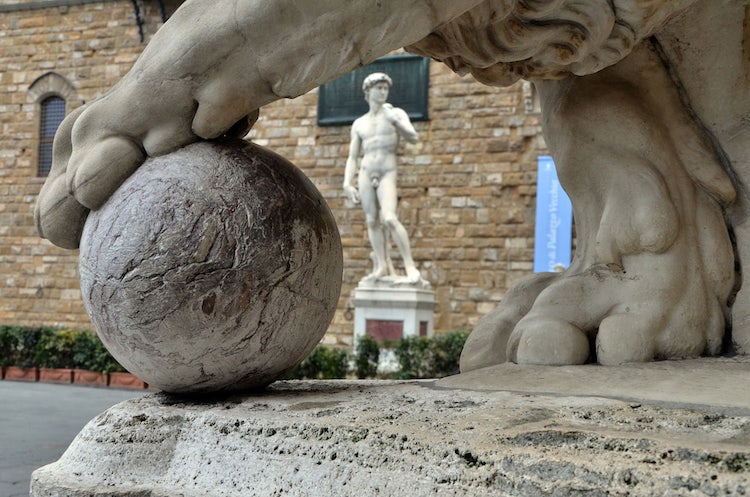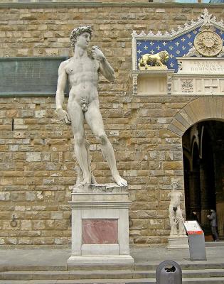 La escultura se colocó delante del palazzo, mirando, orgullosa y desafiantemente, hacia el Sur. Antes se pensó en el Duomo o dentro de la Loggia dei Lanzi, en la misma plaza Signoria pero resguardado. (sigue)
