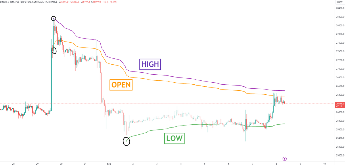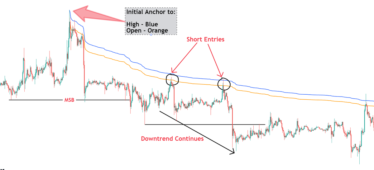 Here is a recent Bitcoin chart showing how you can anchor AVWAP to the high/low as well as open simultaneously. Read it well Chads.