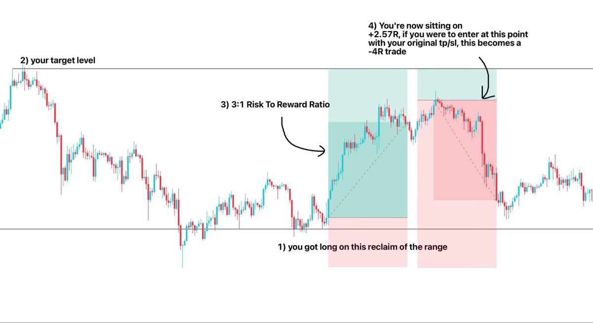 But once the trade moves into your direction, the potential (R) shifts, you're now risking your unrealised gains as well