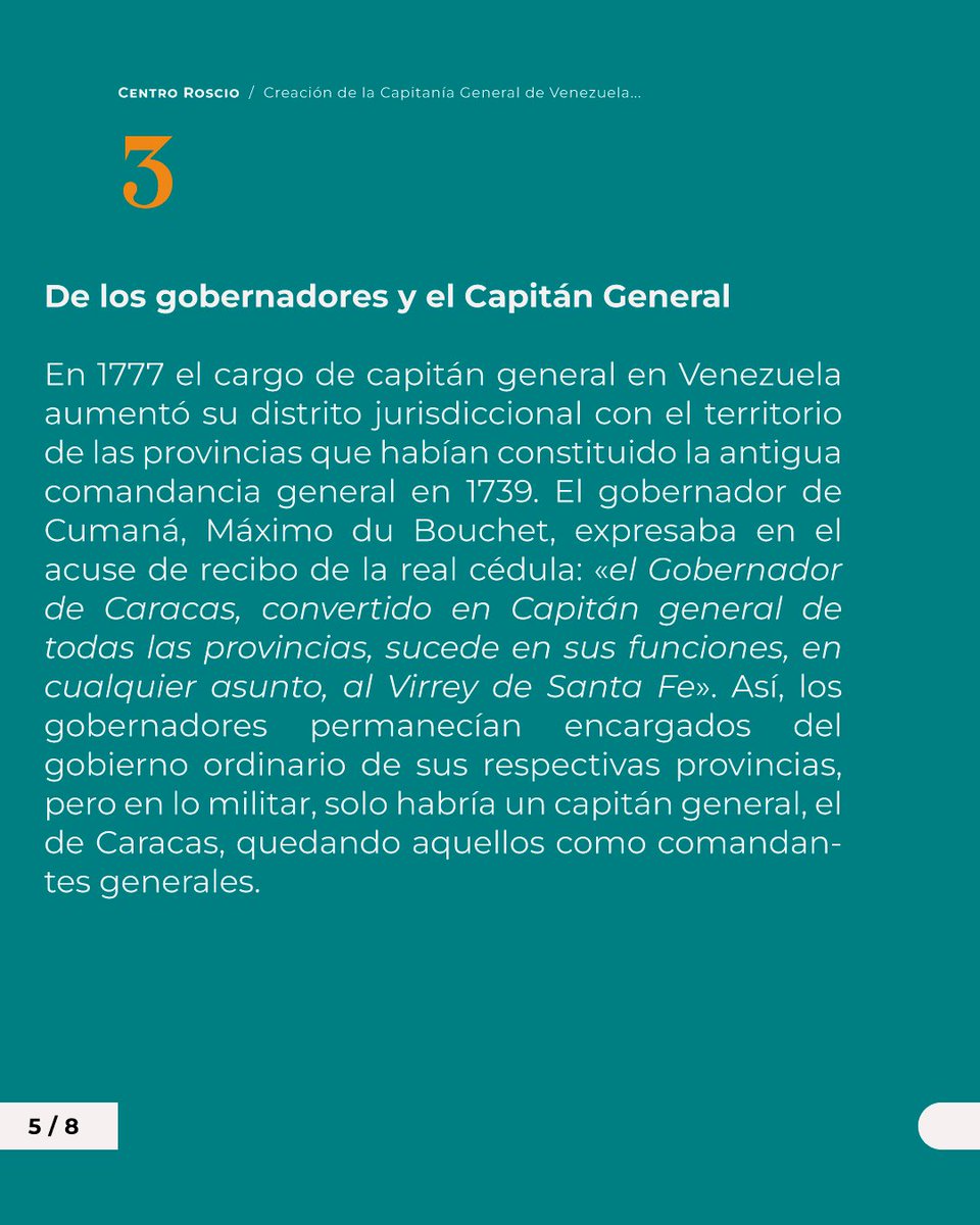 En 1777 el cargo de capitán general en Venezuela aumentó su distrito jurisdiccional con el territorio de las provincias que habían constituido la antigua comandancia general en 1739. El gobernador de Cumaná, Máximo du Bouchet, expresaba en el acuse de recibo de la real cédula: