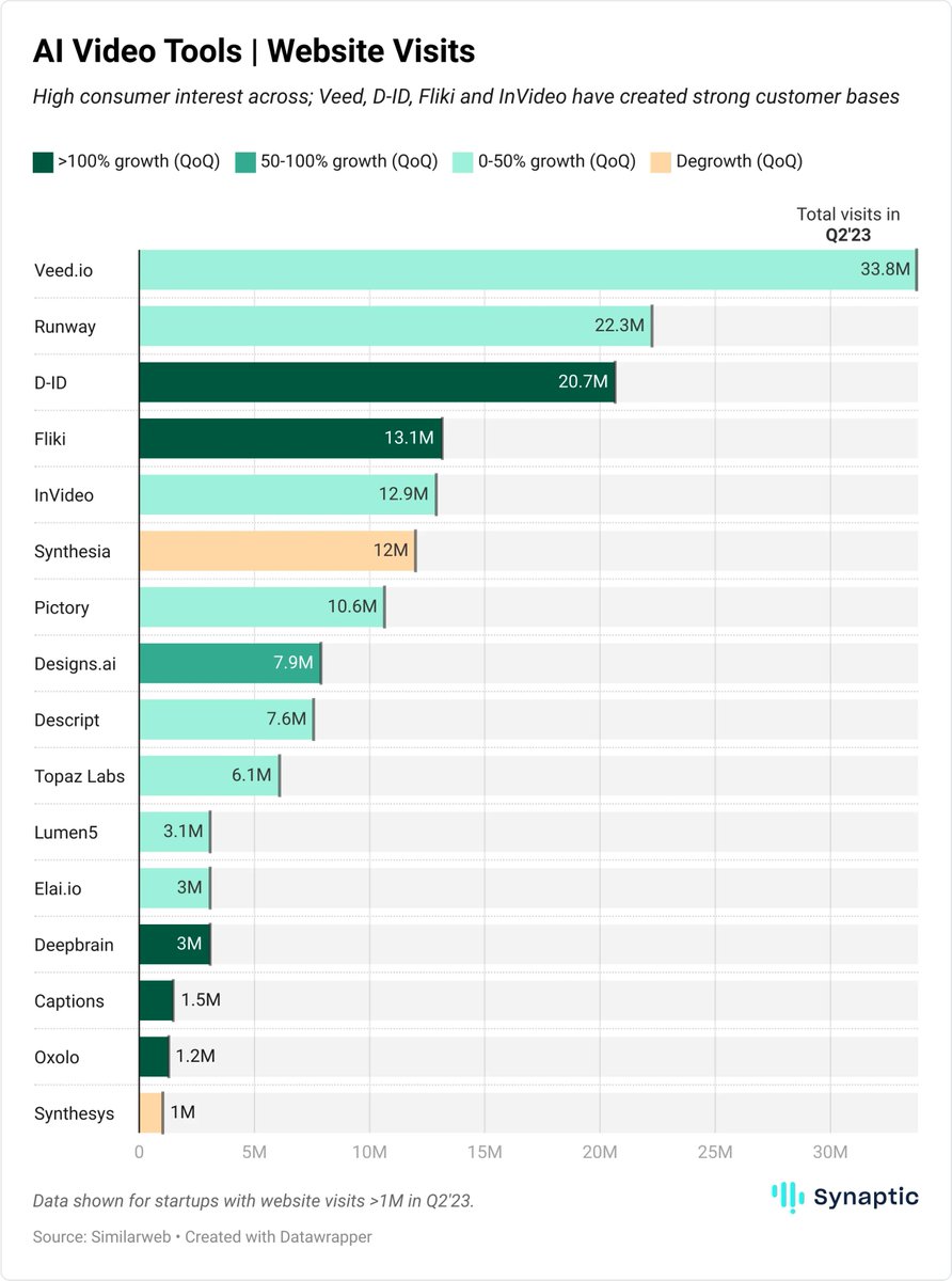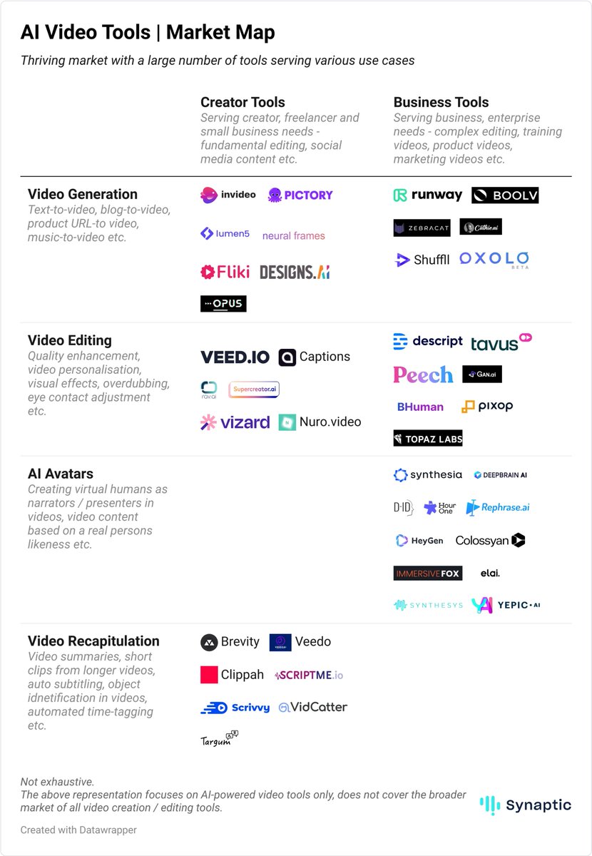 Runway 和 Synthesia 是在 2017-18 年开始尝试生成式 AI 的先驱,并已成为市场领先者。两家公司都诞生于前沿的机器学习研究,由研究人员创立,并建立了自己的专有基础模型 - 但针对不同的用例。